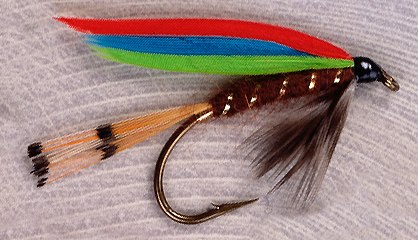 Tag: Gold tinsel Tail: Golden pheasant tippet Body: Reddish brown wool Rib: Gold tinsel Hackle: Grizzly Wing: Scarlet, dark blue, bright green