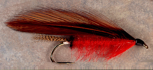 Tag: Flat gold tinsel and white floss Tail: Wood duck Butt: Black ostrich Body: Garnet seal fur Throat: Garnet hackle Wing: Red-brown furnace saddle hackles Source: Leonard, J.E. (1950, 1982) Flies, p. 267