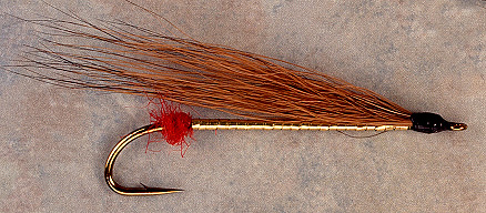 Tail: Red wool tag-tail Body: Flat gold tinsel Wing: Dark brown bucktail Note: Created by William Scripture. Source: Perrault, K.E. (1984) Standard Dictionary of Fishing Flies, p.421