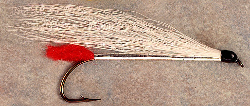 Tail: Red wool tag-tail Body: Flat silver tinsel Wing: White bucktail Source: Ray Bergmans fly tying notes