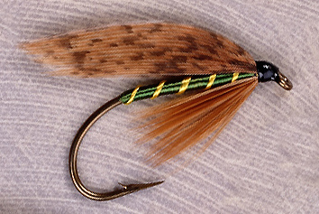 Body: Green silk floss Rib: Yellow silk floss Hackle: Brown Wing: Light brown turkey