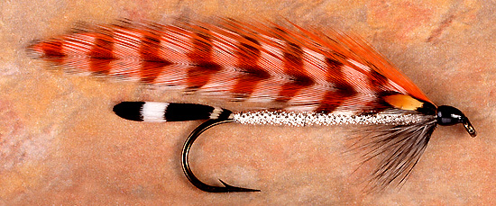 Tail: Barred wood duck Body: Flat silver tinsel Throat: Grizzly collar Wing: Two grizzly over two orange saddle hackles Shoulder: Jungle cock Source: Perrault, K.E. (1984) Standard Dictionary of Fishing Flies, p.422