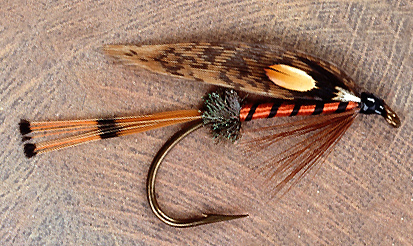 Tag: Peacock herl tag Tail: Golden pheasant tippet Body: Orange silk floss Rib: Black silk Hackle: Brown Wing: Brown turkey, jungle eye