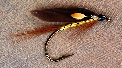 Tag: Gold tinsel Tail: Brown Body: Yellow floss silk Rib: Gold tinsel Hackle: Brown Wing: Slate, jungle eye