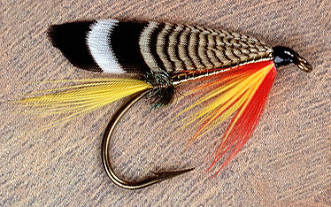 Tag: Peacock herl butt Tail: Yellow Body: Gold tinsel Hackle: Mixed scarlet and yellow Wing: Barred wood duck or Mandarin
