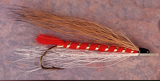 Tag: Flat gold tinsel Tail: Red wool, short Body: Red wool Rib: Flat gold tinsel Belly: White bucktail past bend Wing: Brown bucktail Source: Ray Bergman's fly tying notes