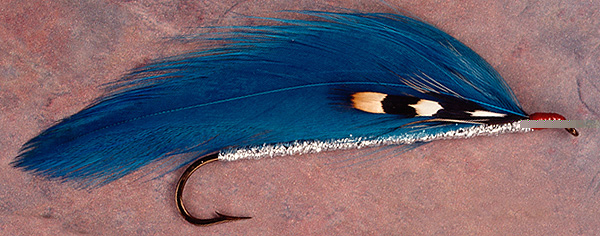 Thread: Red Body: Silver braided mylar tinsel, secured with red band Wing: Four Supervisor blue saddle hackles Cheeks: Jungle cock Source: Stewart, D. and Leeman, B. (1982) Trolling Flies for Trout and Salmon, p. 116