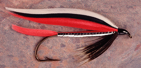 Tail: Red goose or swan Body: Flat silver tinsel Rib: Fine silver wire or oval tinsel (optional) Throat: Cream badger hackle, wound on as a collar and gathered downward Wing: Of married goose or swan (from bottom) in red, black, and white. Cheeks: Jungle cock (optional) Note: Attributed to Keith C. Fulsher. Source: Bates, J.(1950, 1966, 1995) Streamer Fly Tying and Fishing, p. 349